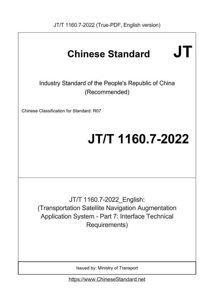 Delivery: <= 3 days. True-PDF full-copy in English will be manually translated and delivered via email. JT/T 1160.7-2022: (Transportation Satellite Navigation Augmentation Application System - Part 7: Interface Technical Requirements) Status: Valid