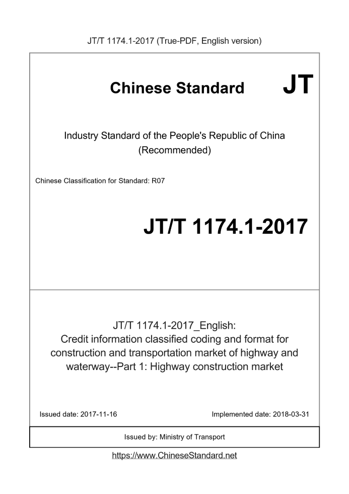 Delivery: <= 6 days. True-PDF full-copy in English will be manually translated and delivered via email. JT/T 1174.1-2017: Credit information classified coding and format for construction and transportation market of highway and waterway--Part 1: Highway construction market Status: Valid