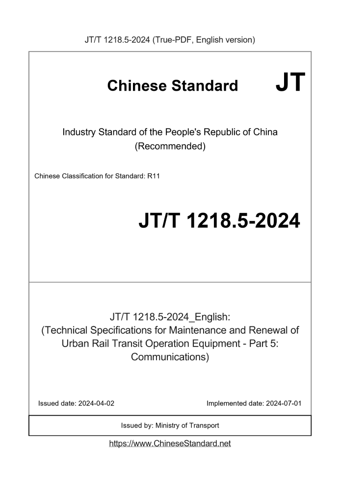 Delivery: <= 4 days. True-PDF full-copy in English will be manually translated and delivered via email. JT/T 1218.5-2024: (Technical Specifications for Maintenance and Renewal of Urban Rail Transit Operation Equipment - Part 5: Communications) Status: Valid
