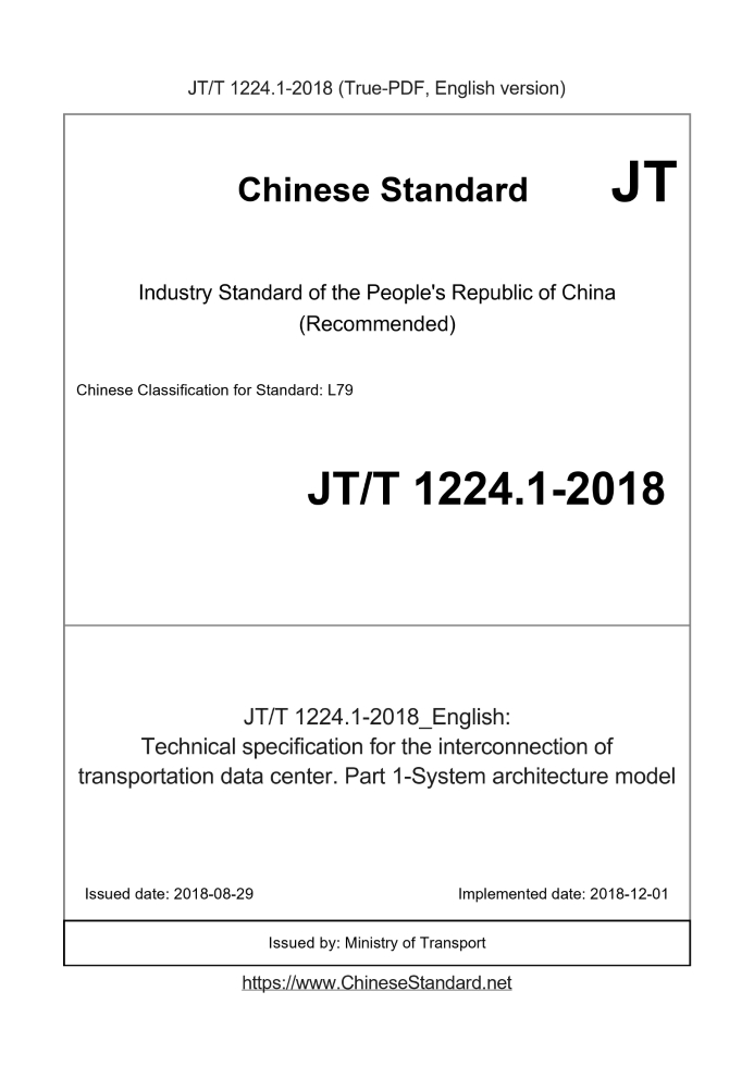 Delivery: <= 3 days. True-PDF full-copy in English will be manually translated and delivered via email. JT/T 1224.1-2018: Technical specification for the interconnection of transportation data center. Part 1-System architecture model Status: Valid