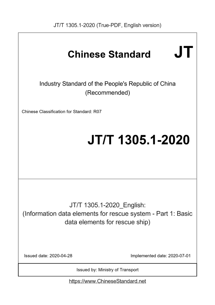 Delivery: <= 9 days. True-PDF full-copy in English will be manually translated and delivered via email. JT/T 1305.1-2020: (Information data elements for rescue system - Part 1: Basic data elements for rescue ship) Status: Valid