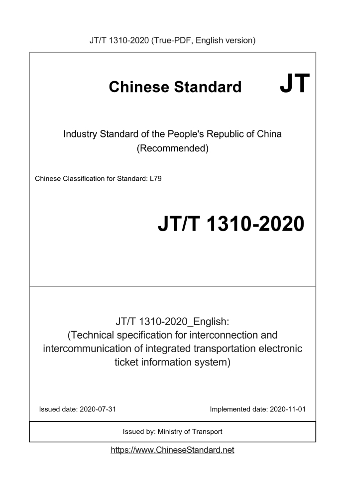 Delivery: <= 4 days. True-PDF full-copy in English will be manually translated and delivered via email. JT/T 1310-2020: (Technical specification for interconnection and intercommunication of integrated transportation electronic ticket information system) Status: Valid