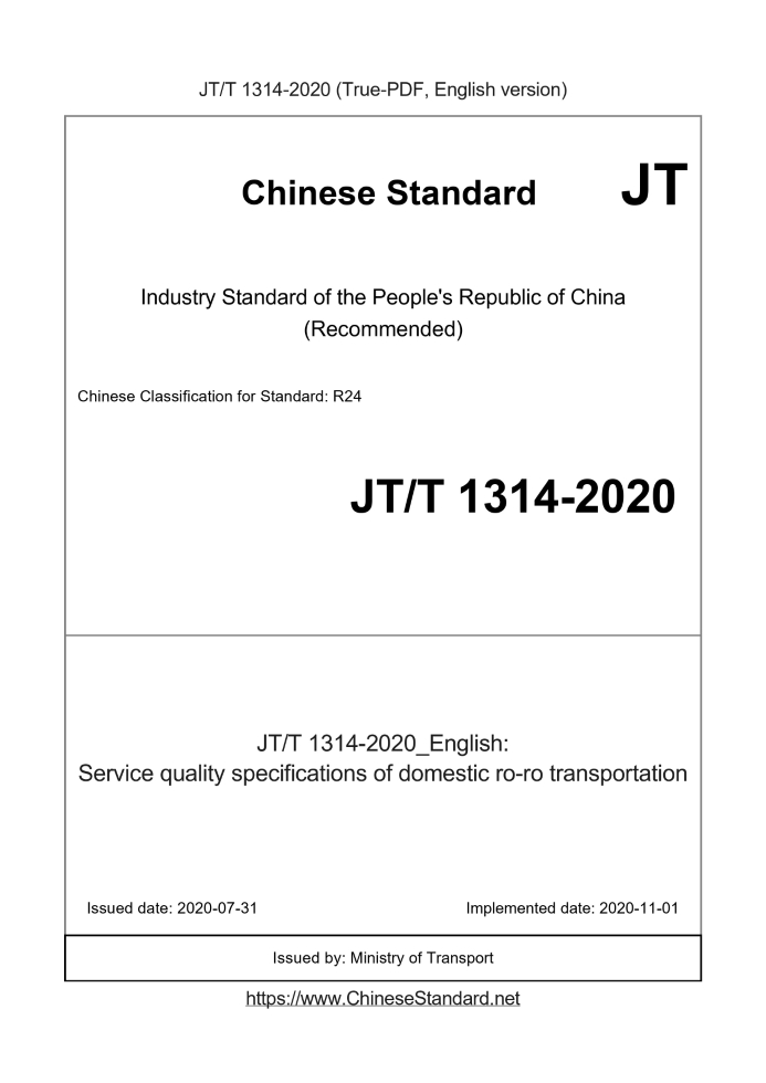 Delivery: <= 3 days. True-PDF full-copy in English will be manually translated and delivered via email. JT/T 1314-2020: Service quality specifications of domestic ro-ro transportation Status: Valid