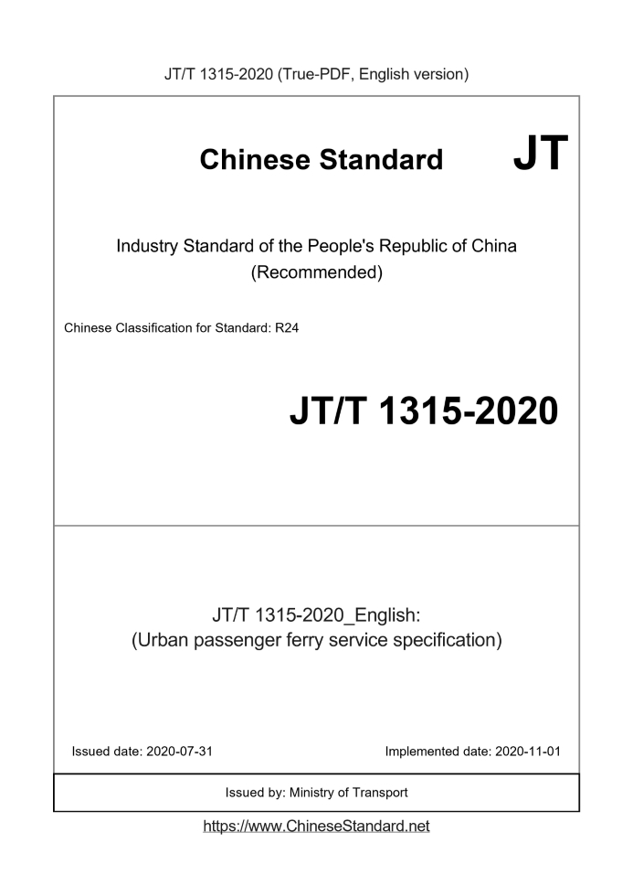 Delivery: <= 3 days. True-PDF full-copy in English will be manually translated and delivered via email. JT/T 1315-2020: (Urban passenger ferry service specification) Status: Valid