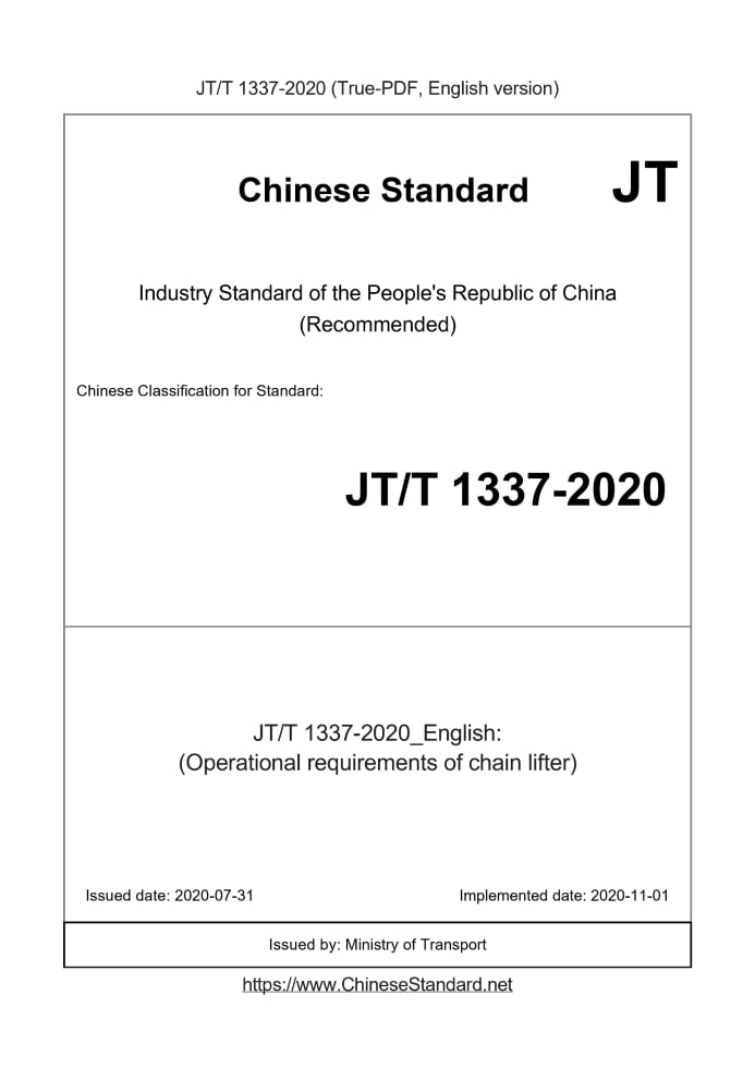 Delivery: <= 3 days. True-PDF full-copy in English will be manually translated and delivered via email. JT/T 1337-2020: (Operational requirements of chain lifter) Status: Valid