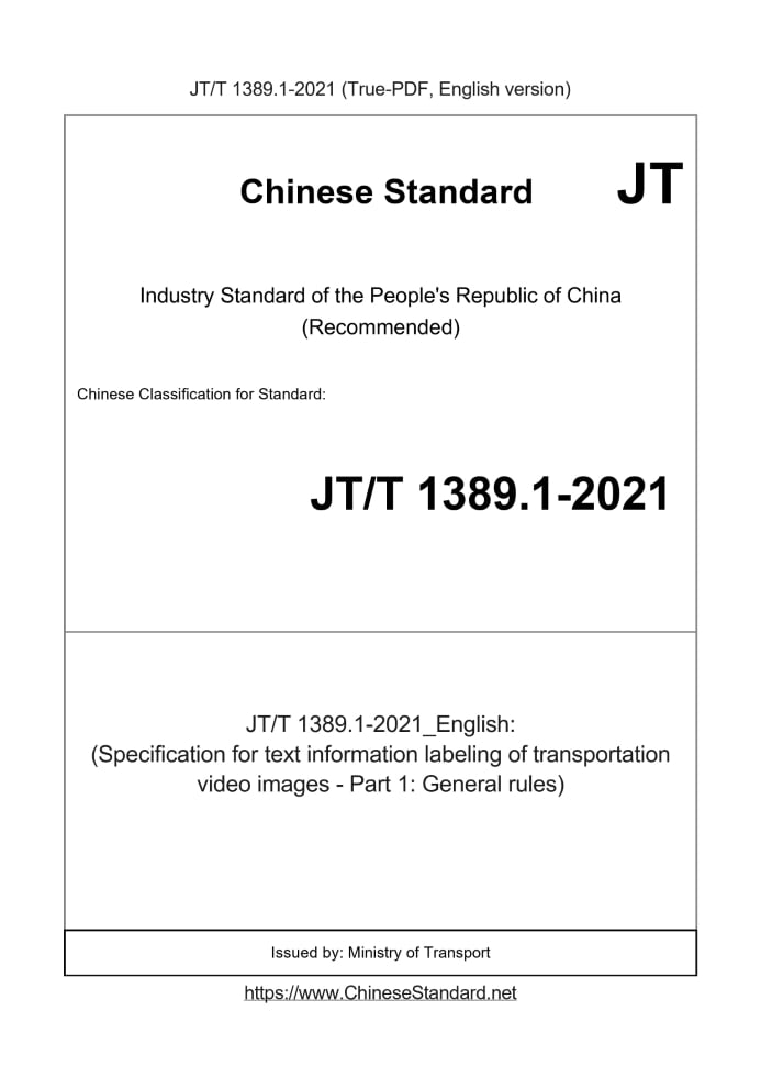 Delivery: <= 3 days. True-PDF full-copy in English will be manually translated and delivered via email. JT/T 1389.1-2021: (Specification for text information labeling of transportation video images - Part 1: General rules) Status: Valid
