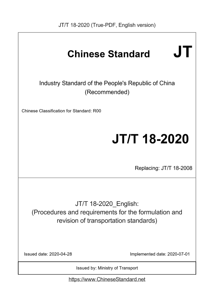 Delivery: <= 5 days. True-PDF full-copy in English will be manually translated and delivered via email. JT/T 18-2020: (Procedures and requirements for the formulation and revision of transportation standards) Status: Valid JT/T 18: Historical versions
