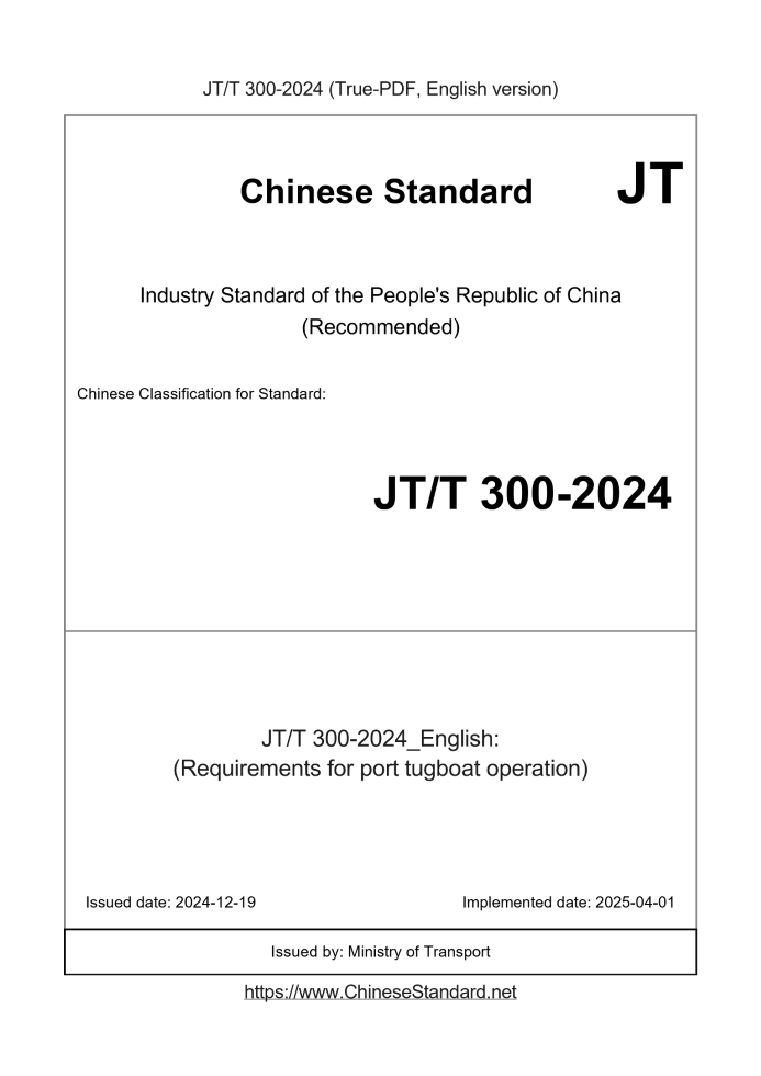 Delivery: <= 3 days. True-PDF full-copy in English will be manually translated and delivered via email. JT/T 300-2024: (Requirements for port tugboat operation) Status: Valid JT/T 300: Historical versions
