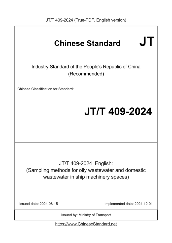 Delivery: <= 3 days. True-PDF full-copy in English will be manually translated and delivered via email. JT/T 409-2024: (Sampling methods for oily wastewater and domestic wastewater in ship machinery spaces) Status: Valid JT/T 409: Historical versions