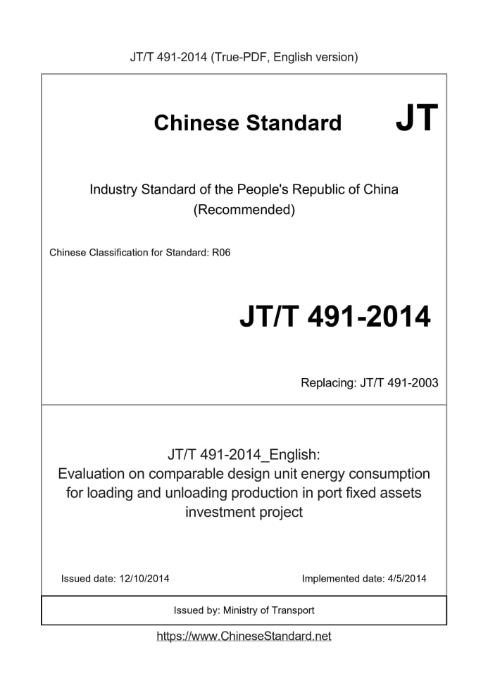 Delivery: <= 3 days. True-PDF full-copy in English will be manually translated and delivered via email. JT/T 491-2014: Evaluation on comparable design unit energy consumption for loading and unloading production in port fixed assets investment project Status: Valid JT/T 491: Historical versions