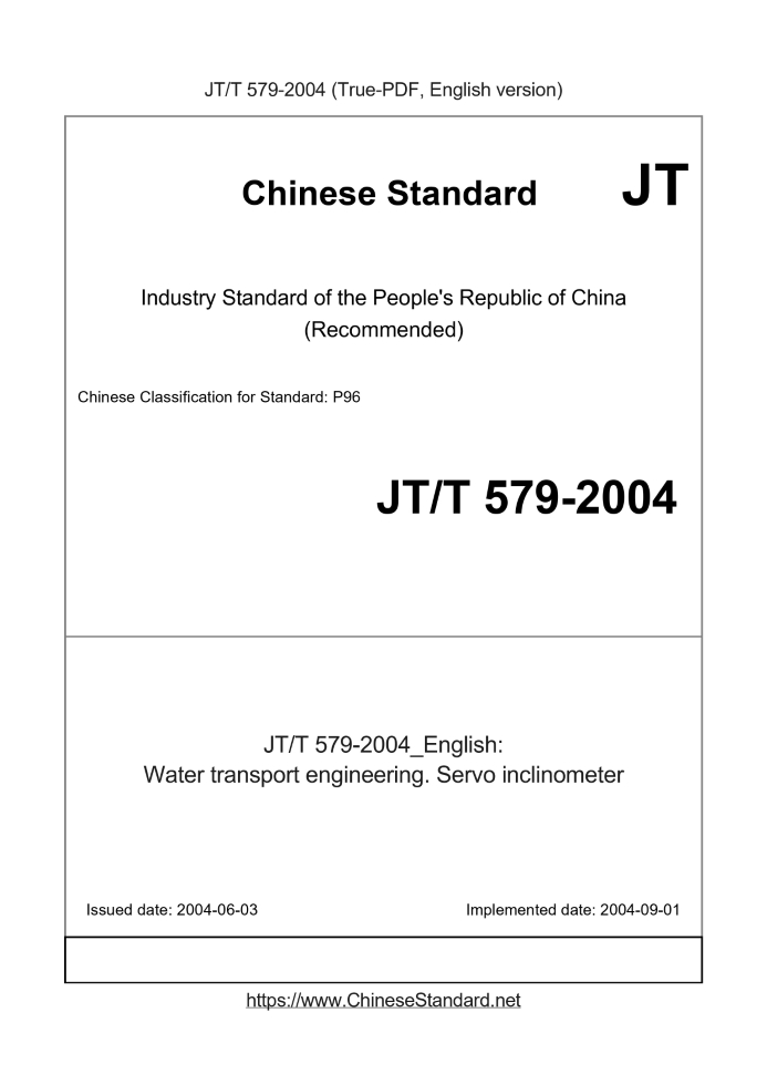 Delivery: <= 3 days. True-PDF full-copy in English will be manually translated and delivered via email. JT/T 579-2004: Water transport engineering. Servo inclinometer Status: Obsolete
