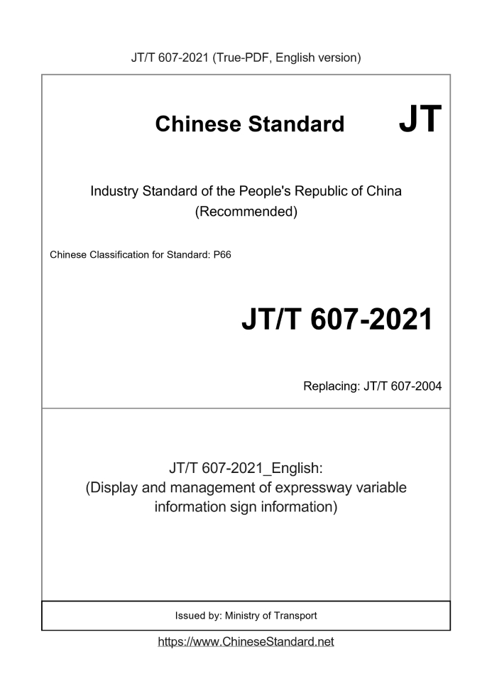Delivery: <= 4 days. True-PDF full-copy in English will be manually translated and delivered via email. JT/T 607-2021: (Display and management of expressway variable information sign information) Status: Valid JT/T 607: Historical versions