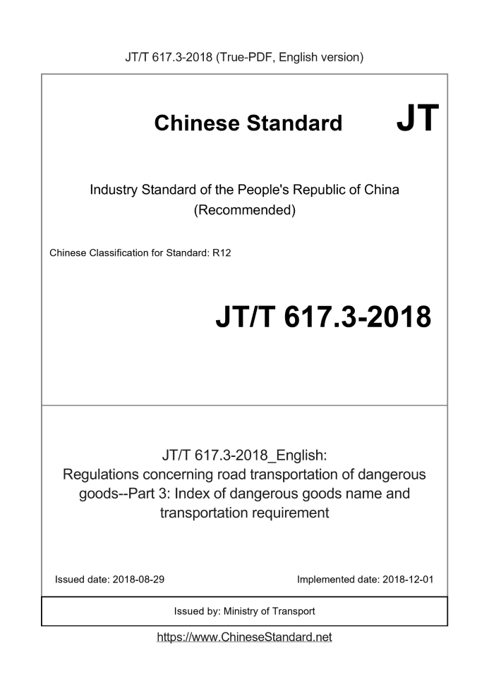 Delivery: <= 24 days. True-PDF full-copy in English will be manually translated and delivered via email. JT/T 617.3-2018: Regulations concerning road transportation of dangerous goods--Part 3: Index of dangerous goods name and transportation requirement Status: Valid