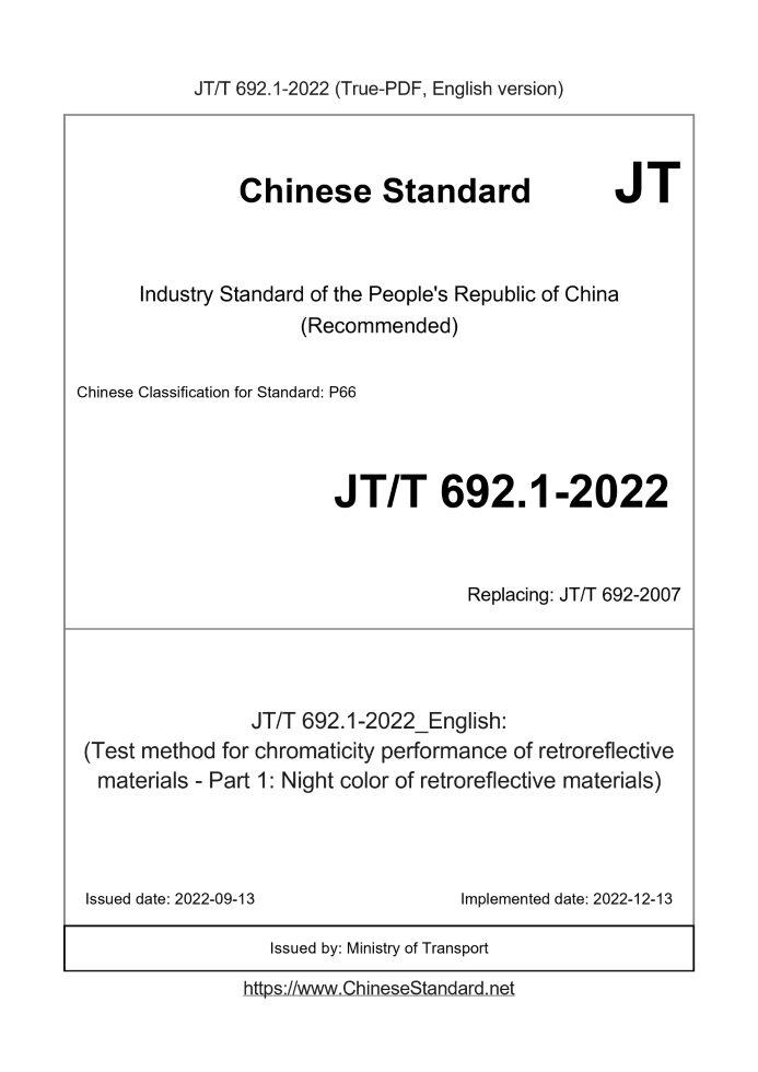 Delivery: <= 3 days. True-PDF full-copy in English will be manually translated and delivered via email. JT/T 692.1-2022: (Test method for chromaticity performance of retroreflective materials - Part 1: Night color of retroreflective materials) Status: Valid JT/T 692.1: Historical versions