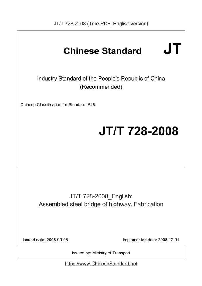 Delivery: <= 4 days. True-PDF full-copy in English will be manually translated and delivered via email. JT/T 728-2008: Assembled steel bridge of highway. Fabrication Status: Valid