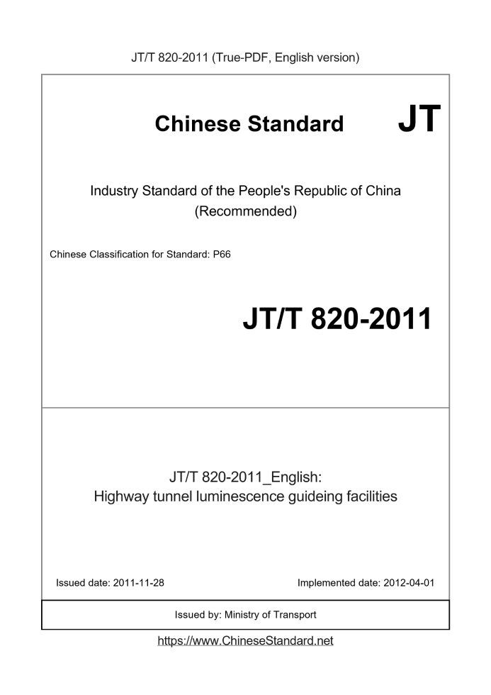 Delivery: <= 3 days. True-PDF full-copy in English will be manually translated and delivered via email. JT/T 820-2011: Highway tunnel luminescence guideing facilities Status: Valid
