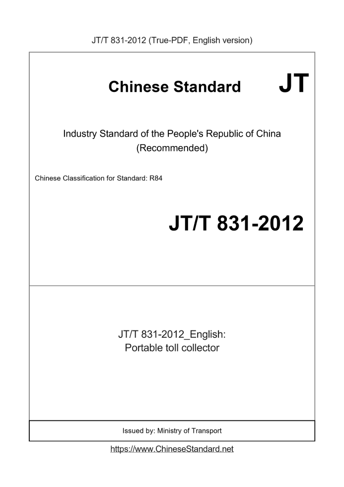 Delivery: <= 3 days. True-PDF full-copy in English will be manually translated and delivered via email. JT/T 831-2012: Portable toll collector Status: Valid