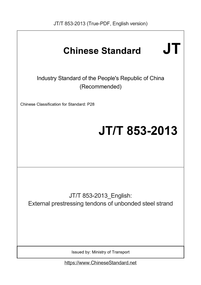 Delivery: <= 5 days. True-PDF full-copy in English will be manually translated and delivered via email. JT/T 853-2013: External prestressing tendons of unbonded steel strand Status: Valid