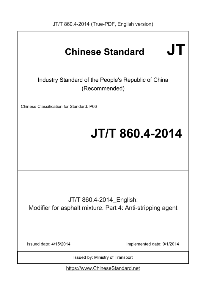 Delivery: <= 3 days. True-PDF full-copy in English will be manually translated and delivered via email. JT/T 860.4-2014: Modifier for asphalt mixture. Part 4: Anti-stripping agent Status: Valid