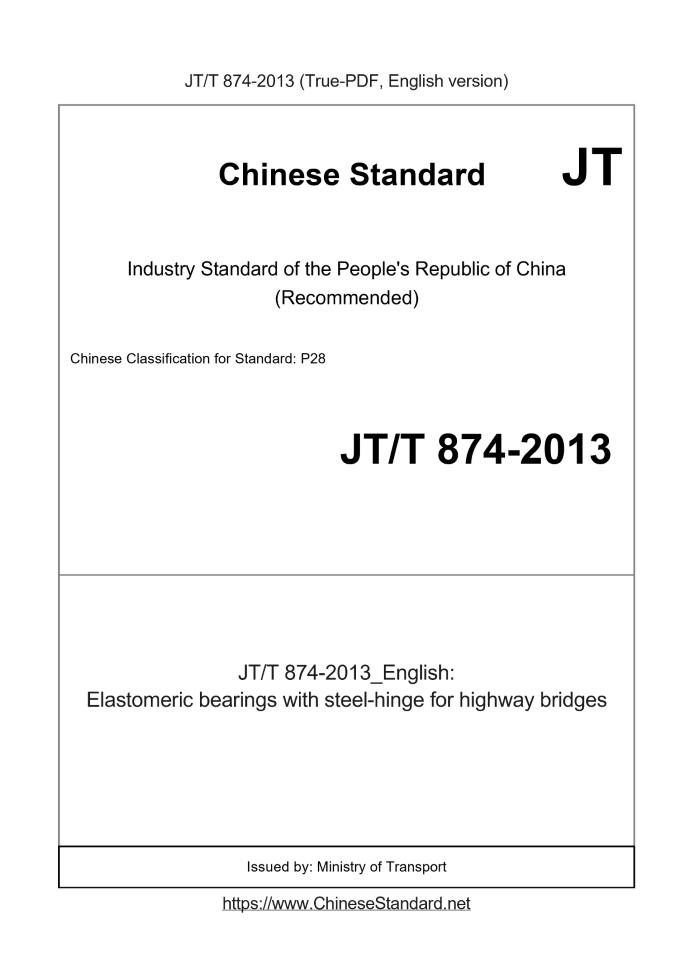 Delivery: <= 4 days. True-PDF full-copy in English will be manually translated and delivered via email. JT/T 874-2013: Elastomeric bearings with steel-hinge for highway bridges Status: Valid