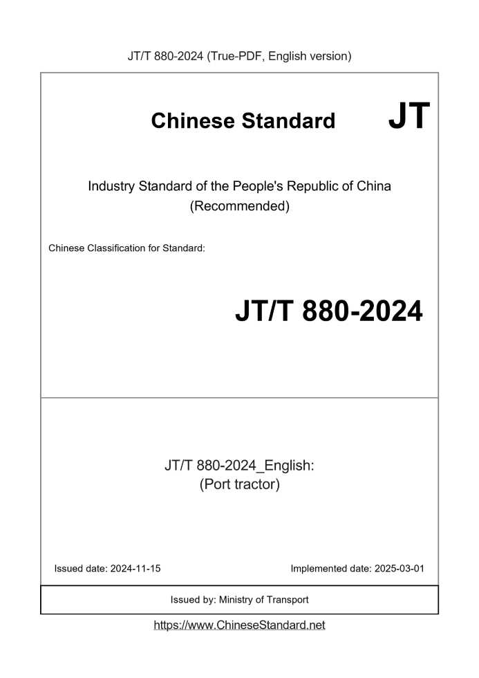 Delivery: <= 5 days. True-PDF full-copy in English will be manually translated and delivered via email. JT/T 880-2024: (Port tractor) Status: Valid JT/T 880: Historical versions