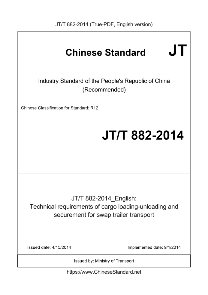 Delivery: <= 5 days. True-PDF full-copy in English will be manually translated and delivered via email. JT/T 882-2014: Technical requirements of cargo loading-unloading and securement for swap trailer transport Status: Valid