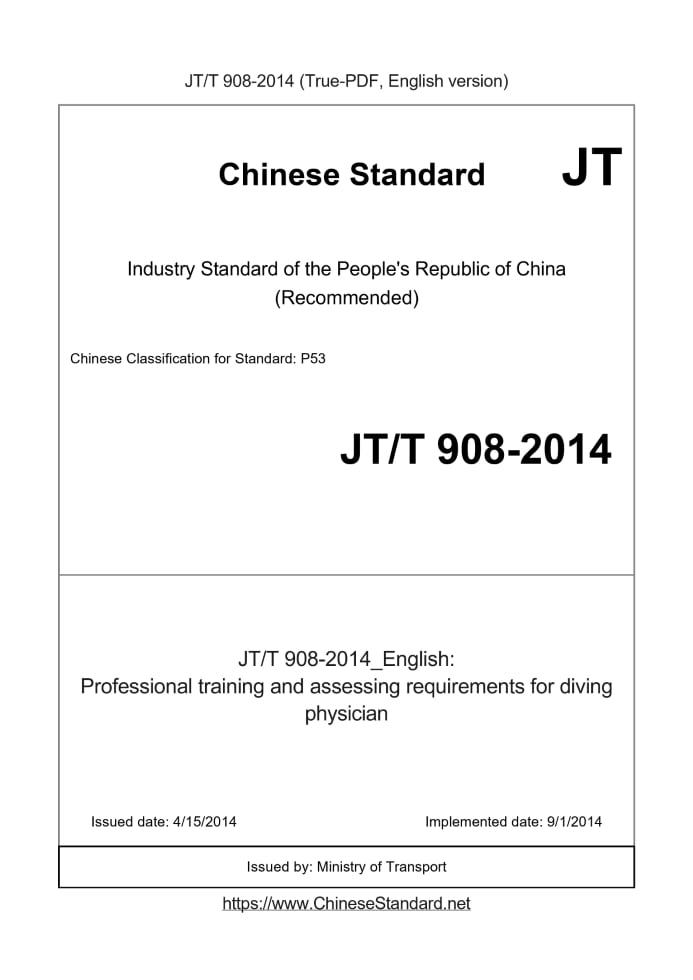 Delivery: <= 3 days. True-PDF full-copy in English will be manually translated and delivered via email. JT/T 908-2014: Professional training and assessing requirements for diving physician Status: Valid