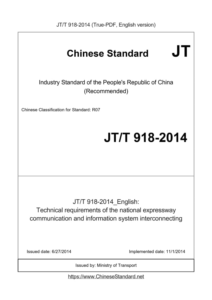 Delivery: <= 5 days. True-PDF full-copy in English will be manually translated and delivered via email. JT/T 918-2014: Technical requirements of the national expressway communication and information system interconnecting Status: Valid