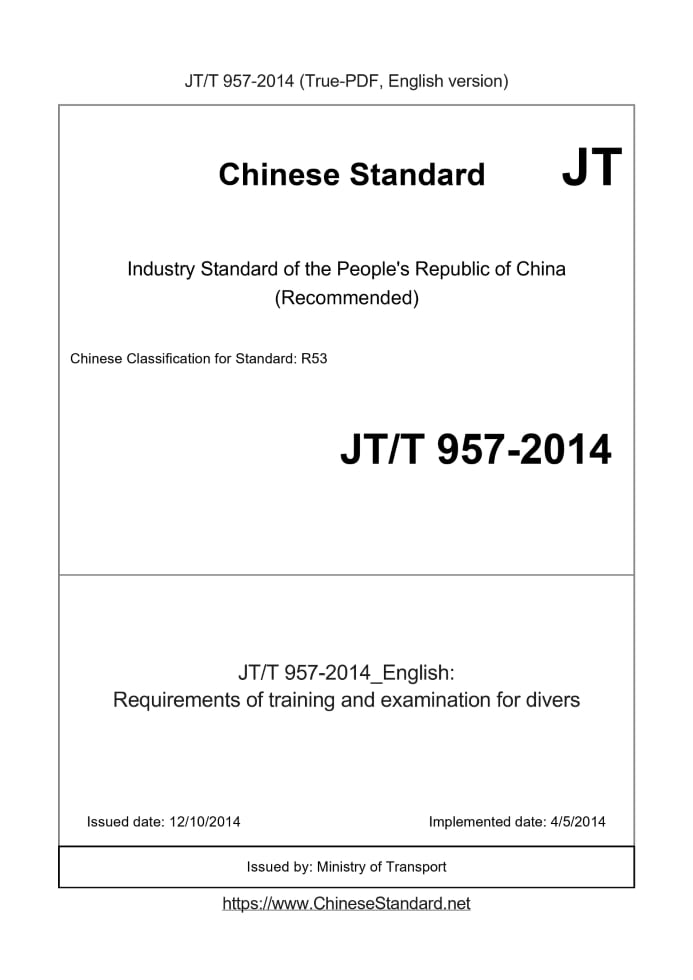 Delivery: <= 4 days. True-PDF full-copy in English will be manually translated and delivered via email. JT/T 957-2014: Requirements of training and examination for divers Status: Valid