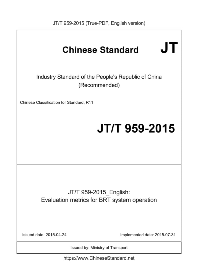 Delivery: <= 4 days. True-PDF full-copy in English will be manually translated and delivered via email. JT/T 959-2015: Evaluation metrics for BRT system operation Status: Valid