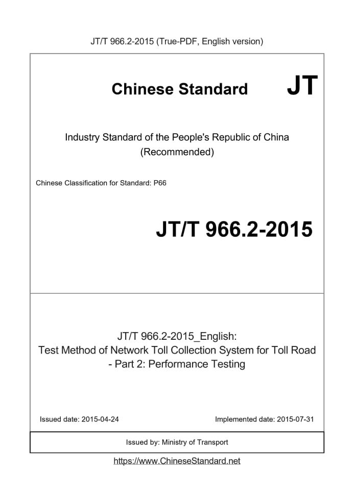 Delivery: <= 4 days. True-PDF full-copy in English will be manually translated and delivered via email. JT/T 966.2-2015: Test Method of Network Toll Collection System for Toll Road - Part 2: Performance Testing Status: Valid