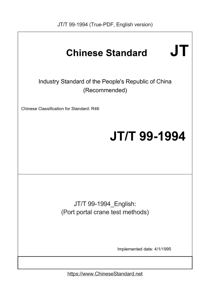 Delivery: <= 5 days. True-PDF full-copy in English will be manually translated and delivered via email. JT/T 99-1994: (Port portal crane test methods) Status: Obsolete