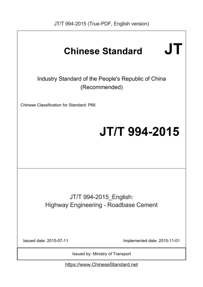 Delivery: <= 3 days. True-PDF full-copy in English will be manually translated and delivered via email. JT/T 994-2015: Highway Engineering - Roadbase Cement Status: Valid