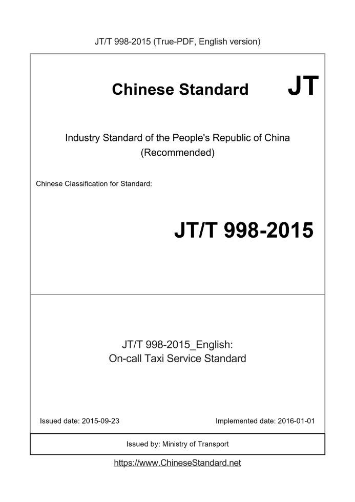 Basic dataStandard ID: JT/T 998-2015 (JT/T998-2015)Description (Translated English): On-call Taxi Service Standard Sector / Industry: Highway & Transportation Industry Standard (Recommended) Date of Issue: 2015-09-23 Date of Implementation: 2016-01-01 Regulation (derived from): Ministry of Transport Announcement 2015 No.43 Issuing agency(ies): Ministry of Transport Tips & Frequently Asked Questions:Question 1: How long will the true-PDF of JT/T 998-2015_English be delivered?Answer: Upon your order, we will start to translate JT/T 998-2015_English as soon as possible, and keep you informed of the progress. The lead time is typically in 9 seconds (download/delivered in 9 seconds). The lengthier the document the longer the lead time.Question 2: Can I share the purchased PDF of JT/T 998-2015_English with my colleagues?Answer: Yes. The purchased PDF of JT/T 998-2015_English will be deemed to be sold to your employer/organization who actually pays for it, including your colleagues and your employer's intranet.Question 3: Does the price include tax/VAT?Answer: Yes. Our tax invoice, downloaded/delivered in 9 seconds, includes all tax/VAT and complies with 100+ countries' tax regulations (tax exempted in 100+ countries) -- See Avoidance of Double Taxation Agreements (DTAs): List of DTAs signed between Singapore and 100+ countriesQuestion 4: Do you accept my currency other than USD?Answer: Yes. If you need your currency to be printed on the invoice, please write an email to Sales@ChineseStandard.net. In 2 working-hours, we will create a special link for you to pay in any currencies. Otherwise, follow the normal steps: Add to Cart -- Checkout -- Select your currency to pay. |