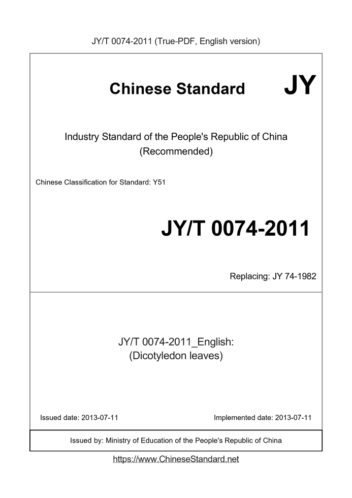 | JY/T 0074-2011 English PDFUS$99.00 ยท In stock Delivery: <= 3 days. True-PDF full-copy in English will be manually translated and delivered via email. JY/T 0074-2011: (Dicotyledon leaves) Status: Valid