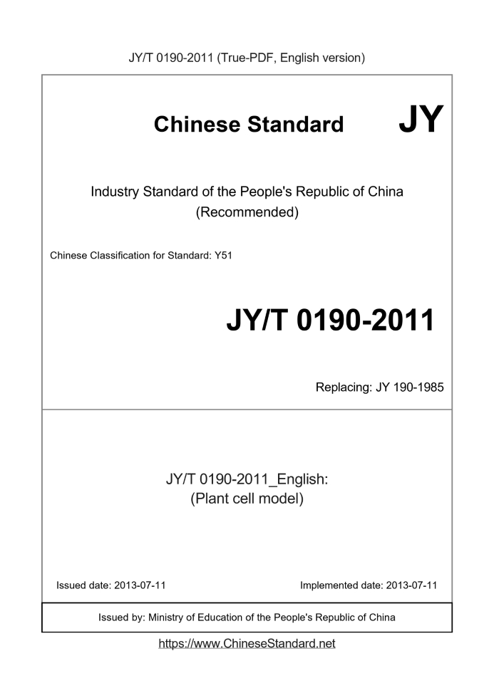 | JY/T 0190-2011 English PDFUS$129.00 · In stock Delivery: <= 3 days. True-PDF full-copy in English will be manually translated and delivered via email. JY/T 0190-2011: (Plant cell model) Status: Valid
