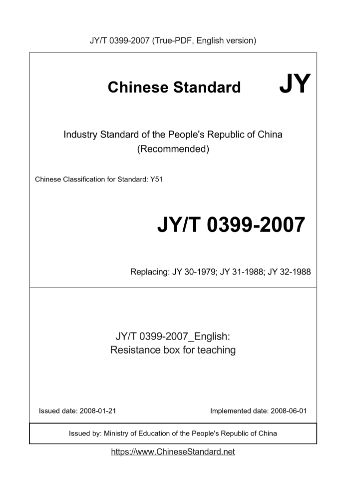 Delivery: <= 3 days. True-PDF full-copy in English will be manually translated and delivered via email. JY/T 0399-2007: Resistance box for teaching Status: Valid