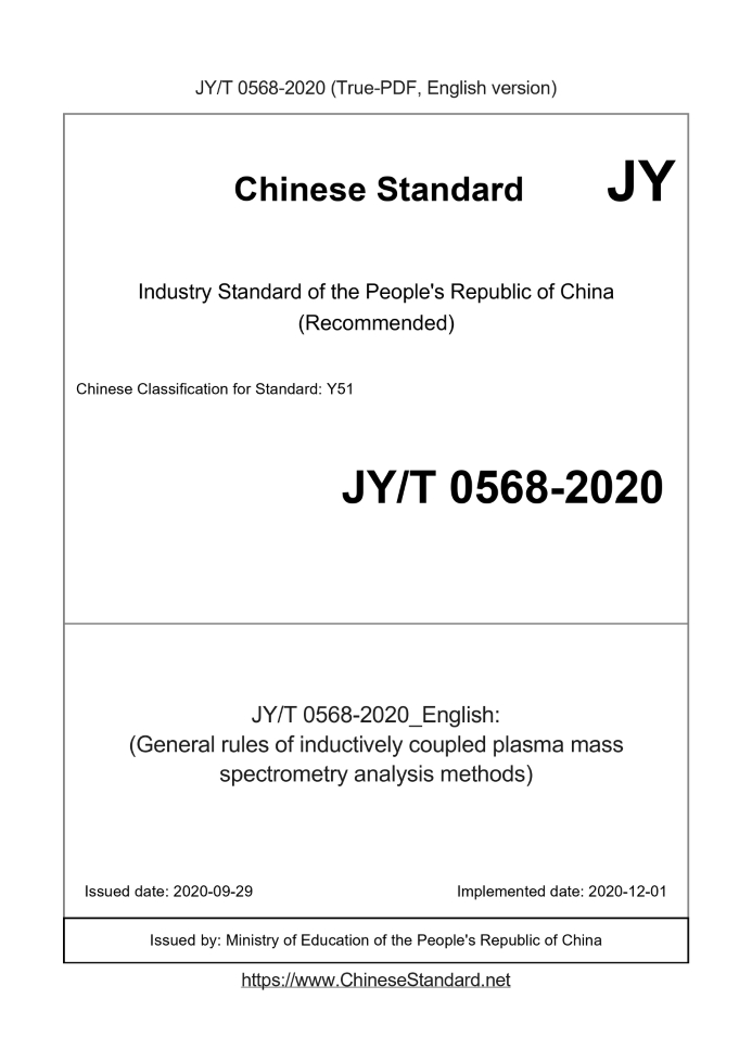 Delivery: <= 4 days. True-PDF full-copy in English will be manually translated and delivered via email. JY/T 0568-2020: (General rules of inductively coupled plasma mass spectrometry analysis methods) Status: Valid