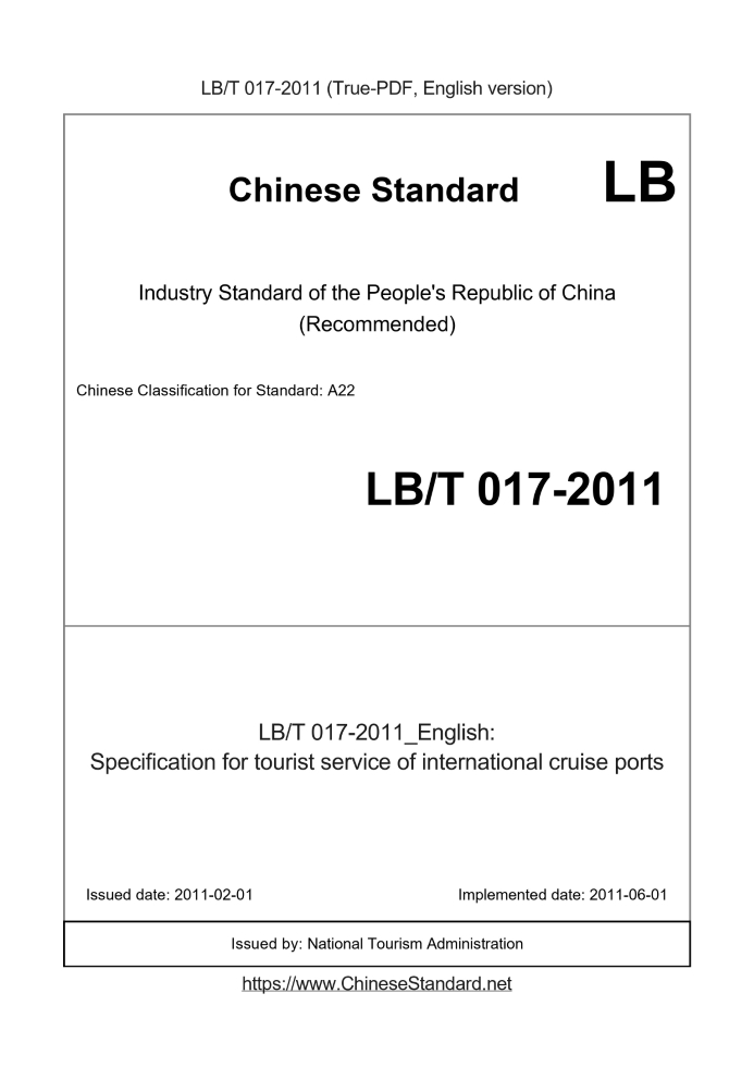 Delivery: <= 3 days. True-PDF full-copy in English will be manually translated and delivered via email. LBT017-2011: Specification for tourist service of international cruise ports Status: Valid
