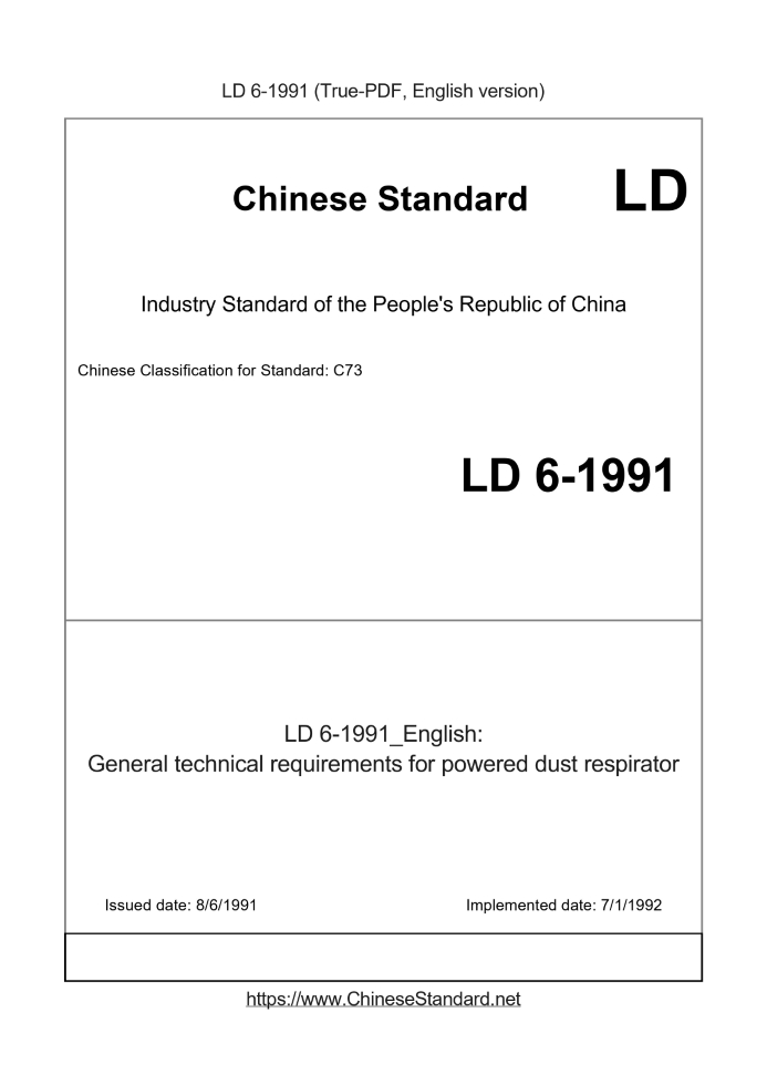 Delivery: <= 3 days. True-PDF full-copy in English will be manually translated and delivered via email. LD6-1991: General technical requirements for powered dust respirator