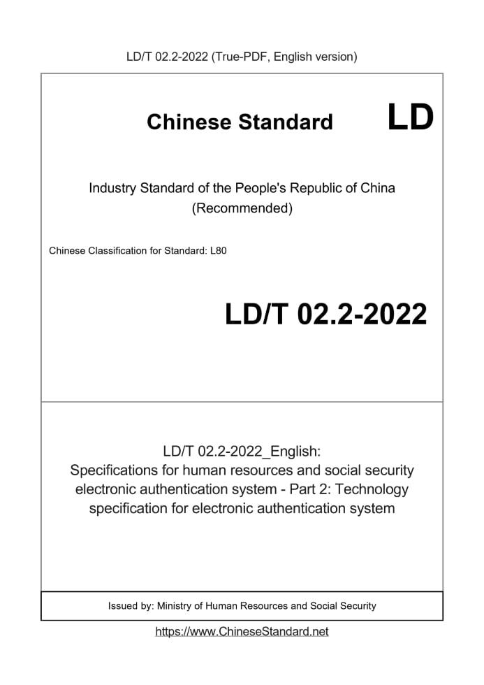 Delivery: <= 6 days. True-PDF full-copy in English will be manually translated and delivered via email. LDT02.2-2022: Specifications for human resources and social security electronic authentication system - Part 2: Technology specification for electronic authentication system Status: Valid