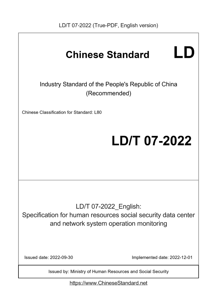 Delivery: <= 3 days. True-PDF full-copy in English will be manually translated and delivered via email. LDT07-2022: Specification for human resources social security data center and network system operation monitoring Status: Valid