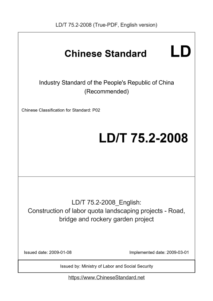 Delivery: <= 4 days. True-PDF full-copy in English will be manually translated and delivered via email. LDT75.2-2008: Construction of labor quota landscaping projects - Road, bridge and rockery garden project Status: Valid