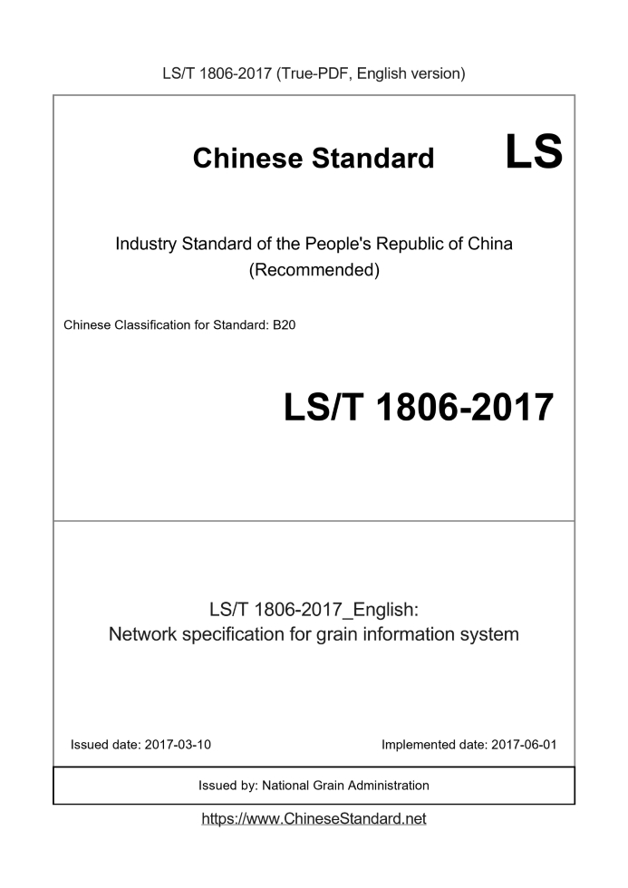 Delivery: <= 3 days. True-PDF full-copy in English will be manually translated and delivered via email. LST1806-2017: Network specification for grain information system Status: Valid