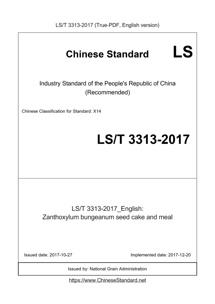 Delivery: <= 3 days. True-PDF full-copy in English will be manually translated and delivered via email. LST3313-2017: Zanthoxylum bungeanum seed cake and meal Status: Valid