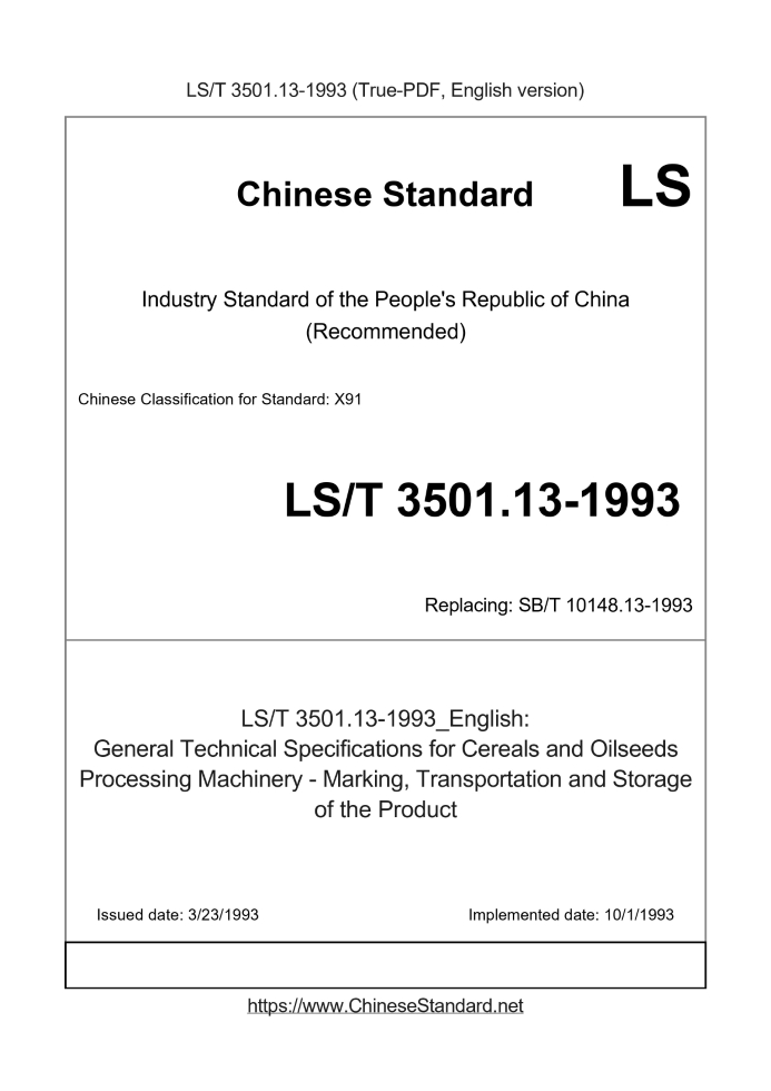 Delivery: <= 2 days. True-PDF full-copy in English will be manually translated and delivered via email. LST3501.13-1993: General Technical Specifications for Cereals and Oilseeds Processing Machinery - Marking, Transportation and Storage of the Product