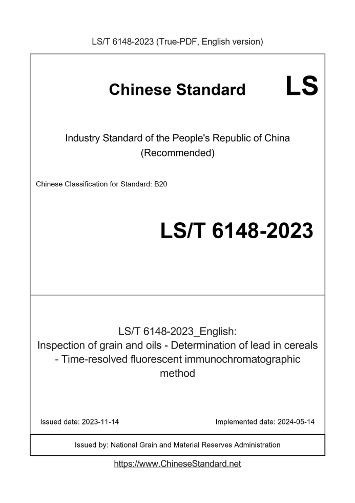 Delivery: <= 3 days. True-PDF full-copy in English will be manually translated and delivered via email. LST6148-2023: Inspection of grain and oils - Determination of lead in cereals - Time-resolved fluorescent immunochromatographic method Status: Valid