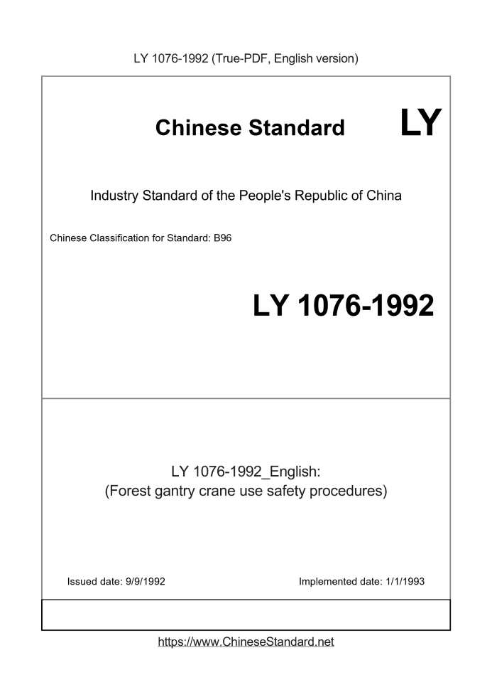 Delivery: <= 2 days. True-PDF full-copy in English will be manually translated and delivered via email. LY 1076-1992: (Forest gantry crane use safety procedures) Status: Obsolete
