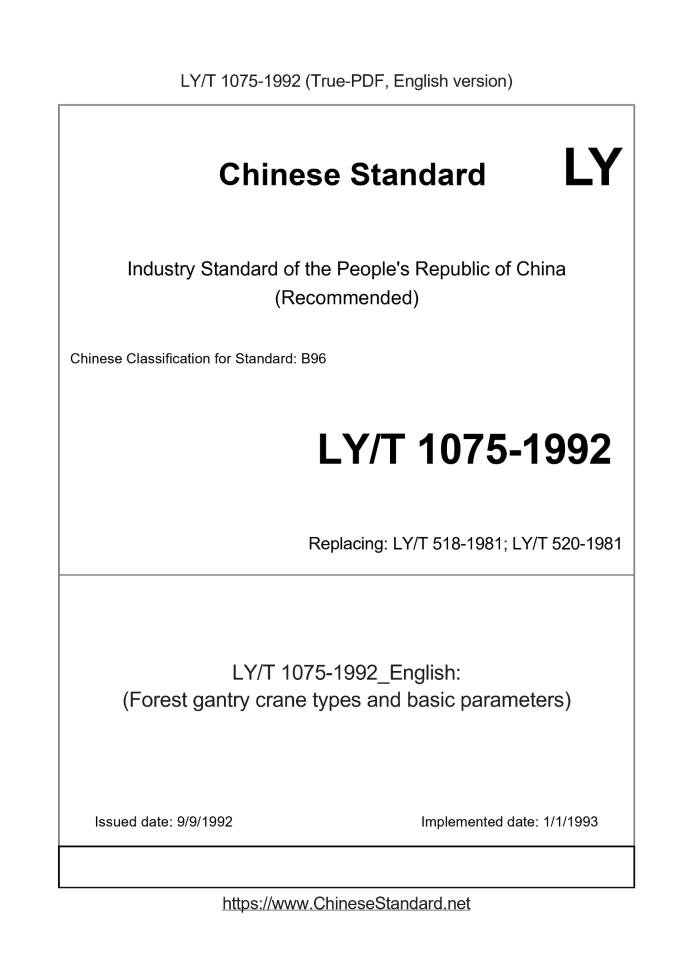 Delivery: <= 2 days. True-PDF full-copy in English will be manually translated and delivered via email. LY/T 1075-1992: (Forest gantry crane types and basic parameters) Status: Obsolete