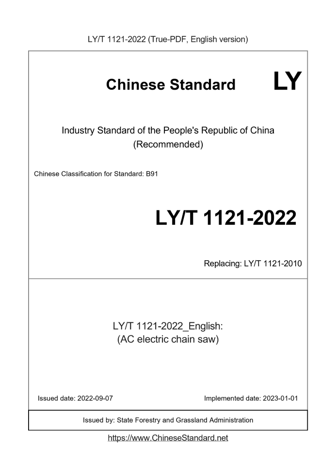 Delivery: <= 3 days. True-PDF full-copy in English will be manually translated and delivered via email. LY/T 1121-2022: (AC electric chain saw) Status: Valid LY/T 1121: Historical versions